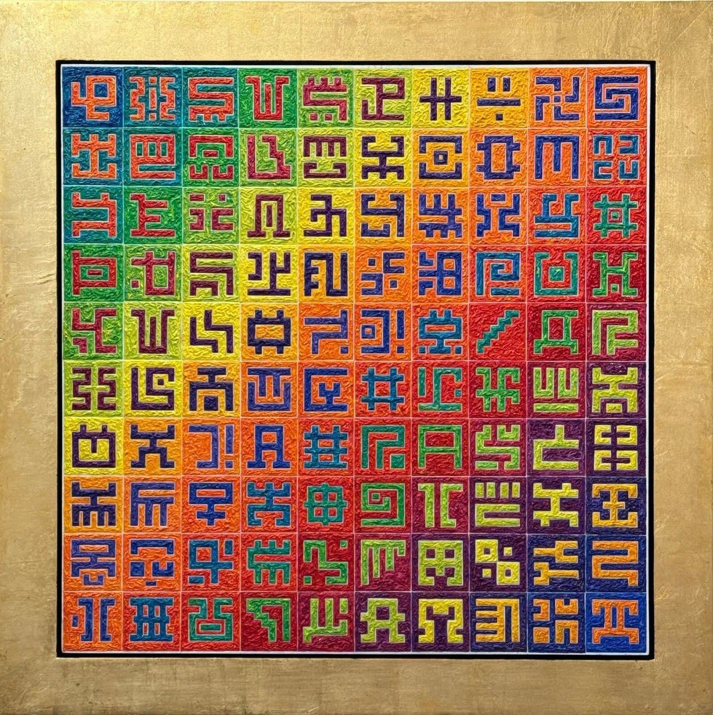 SECRET WRITING in Grey's paintings is comprised of twenty unpronounceable letters, sometimes randomly arranged, but often in a consistent "mantric" order. These untranslatable letters point to the inexpressible outpouring of creative essence, a spirit embedded in communication that cannot be reduced to concepts. SECRET WRITING, a language of pure spirit, while it appears to communicate, actually avoids any association with sound and are indecipherable. SECRET WRITING serves as a window of the rational mind through which invisible thoughts are physically manifest in language and in all forms of creative expression.