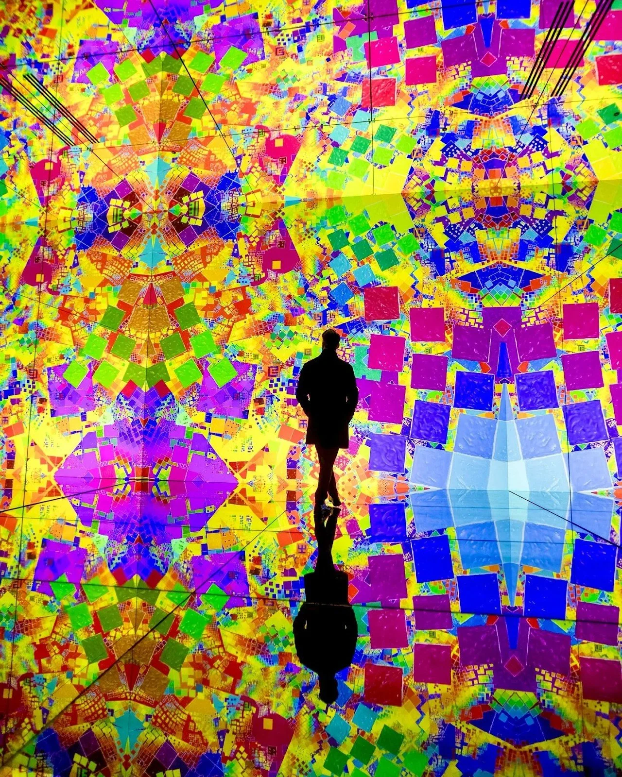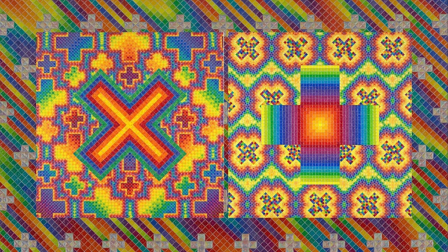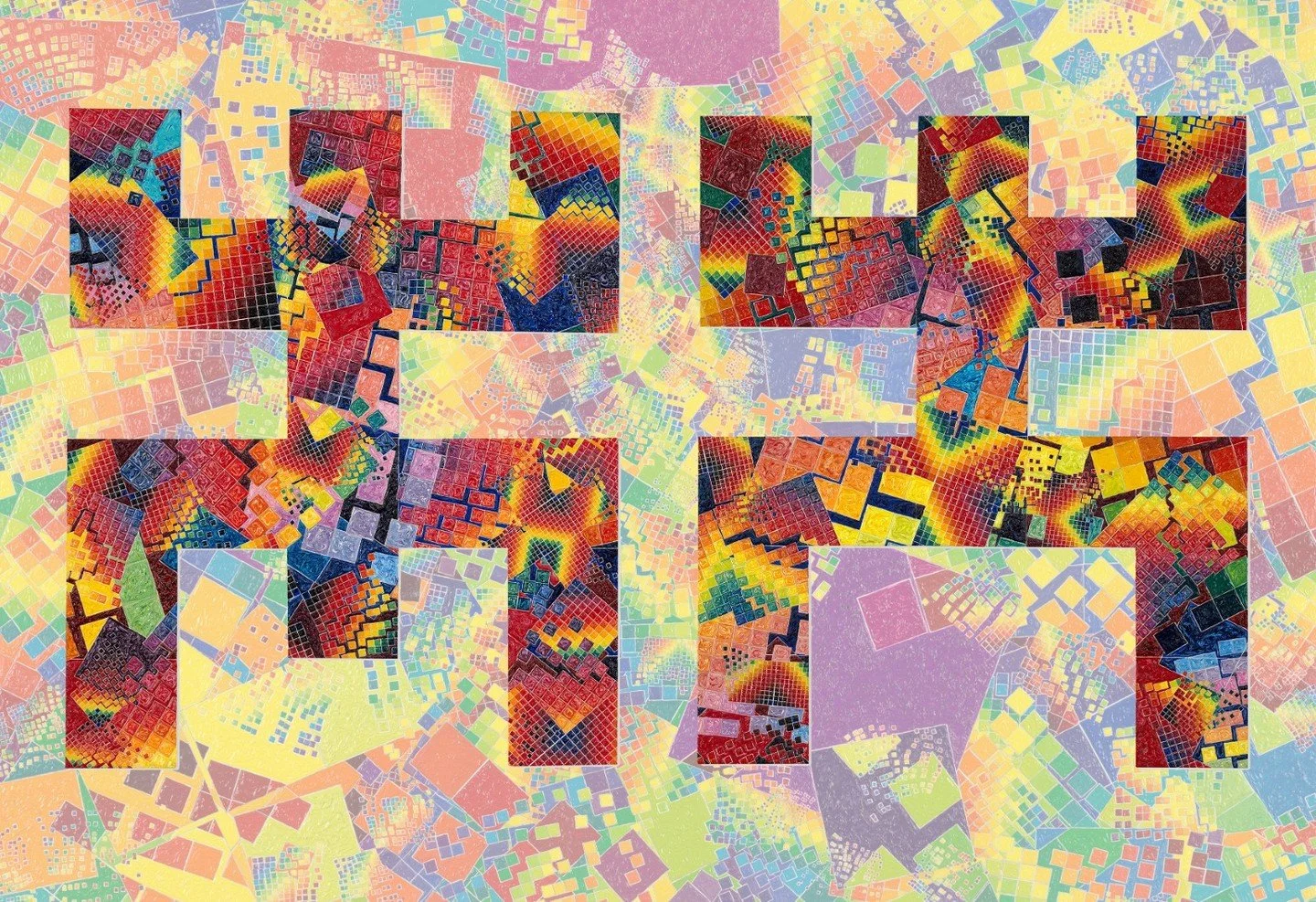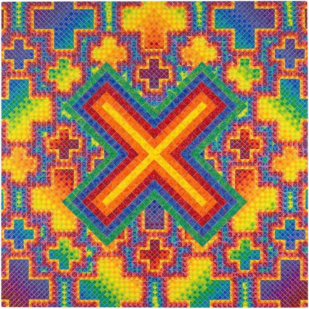 ORDER within this essentialized system, is represented by seven grids, layered in a square/diamond mandalic portal. The viewer gazes into the cosmic fountain and drain of energy, the suck hole/blow hole of interconnected, multi-colored energy packets. This painted symbol of ORDER suggests the purity and perfection of the invisible realm of bliss one might experience in transcendental states of mystic unity, sometimes referred to as Nirvana, Heaven, or the Infinite Divine.